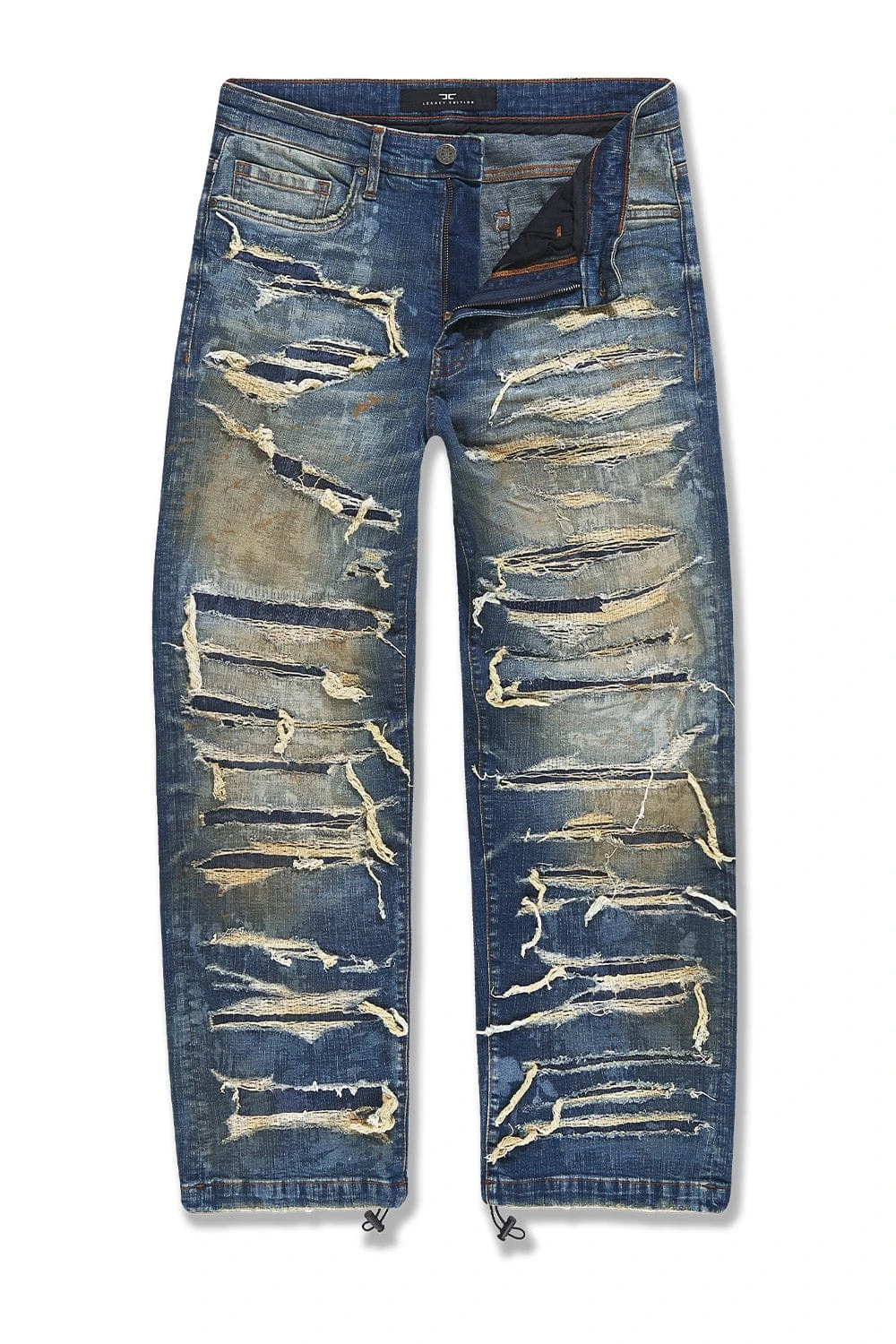 - Rip and repair design with raw denim backing