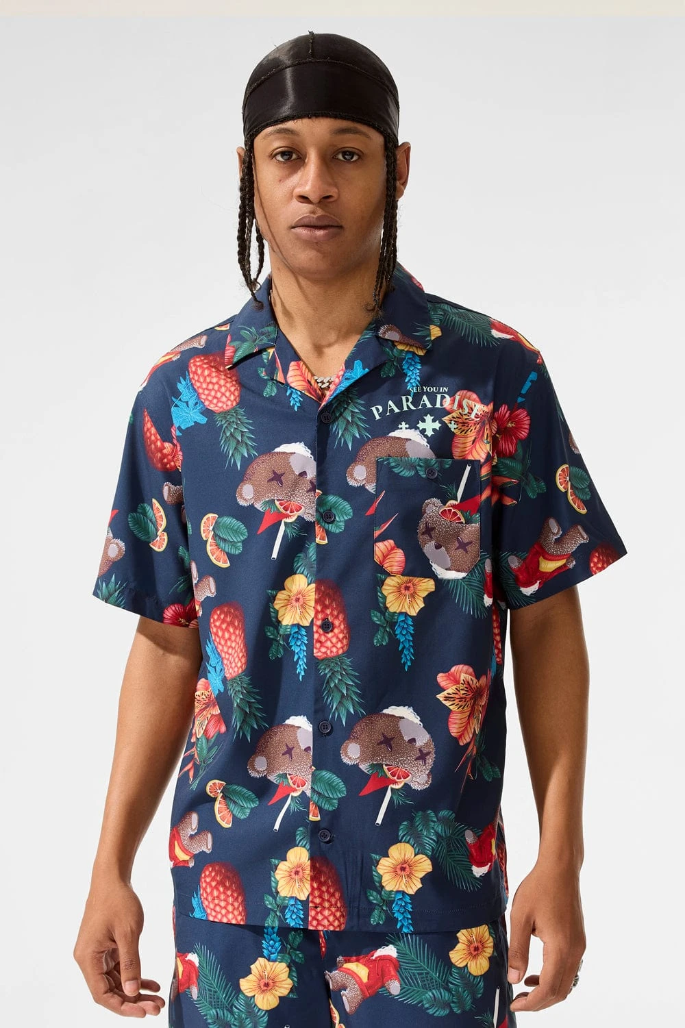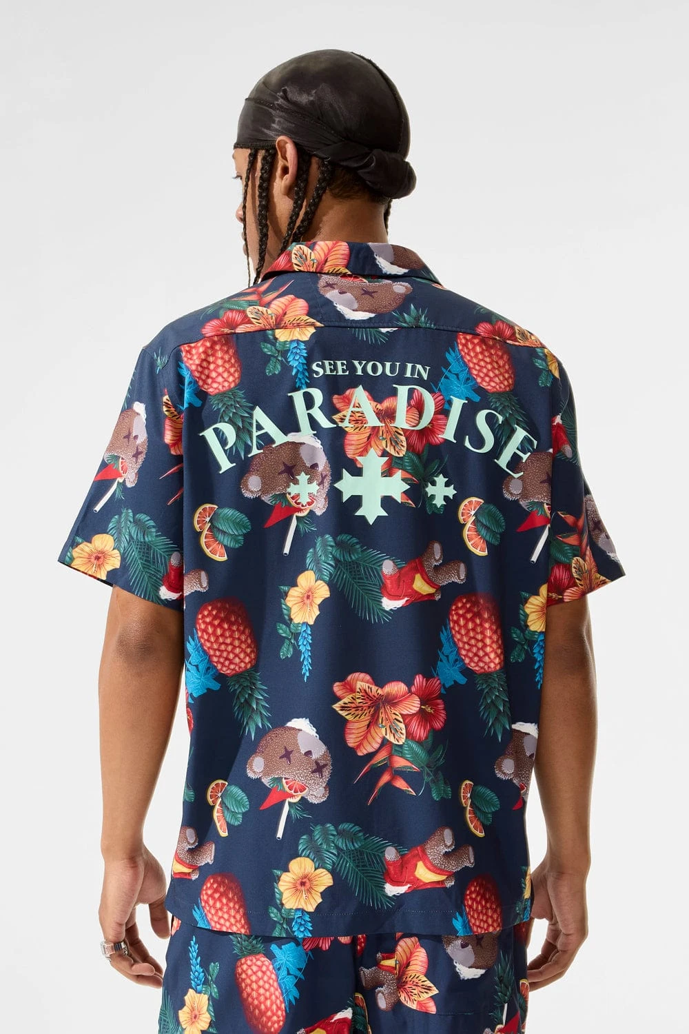 *Cozy is 6’1″ and weighs 170 lbs. He is wearing our Mai Tai S/S Party Shirt (Size Large) in Plush Beach