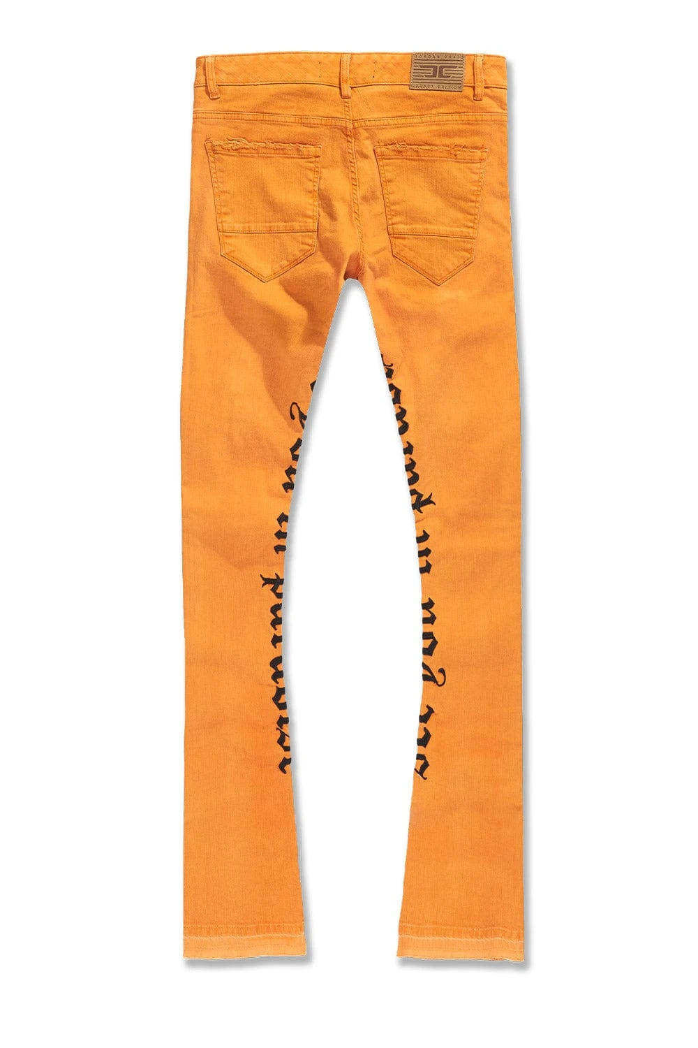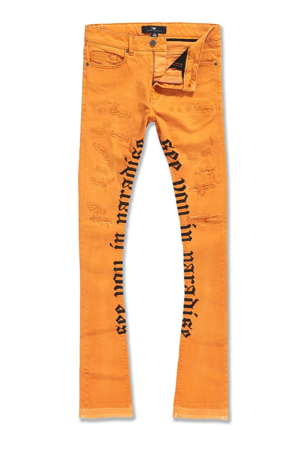 *Khadim is 6’1″ and weighs 170 lbs. He is wearing our Martin Stacked – See You In Paradise Denim (32″) in Tangerine