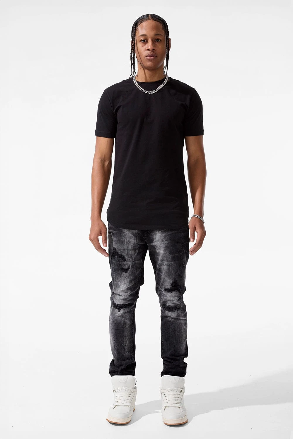 *Cozy is 6’1″ and weighs 170 lbs. He is wearing our Sean – Driftwood Denim (32×32) in Black Ice