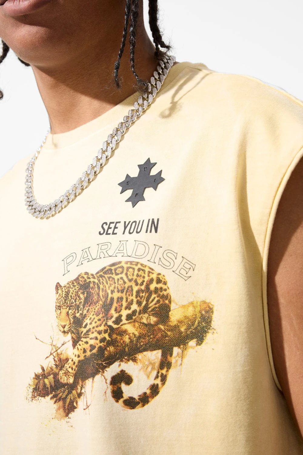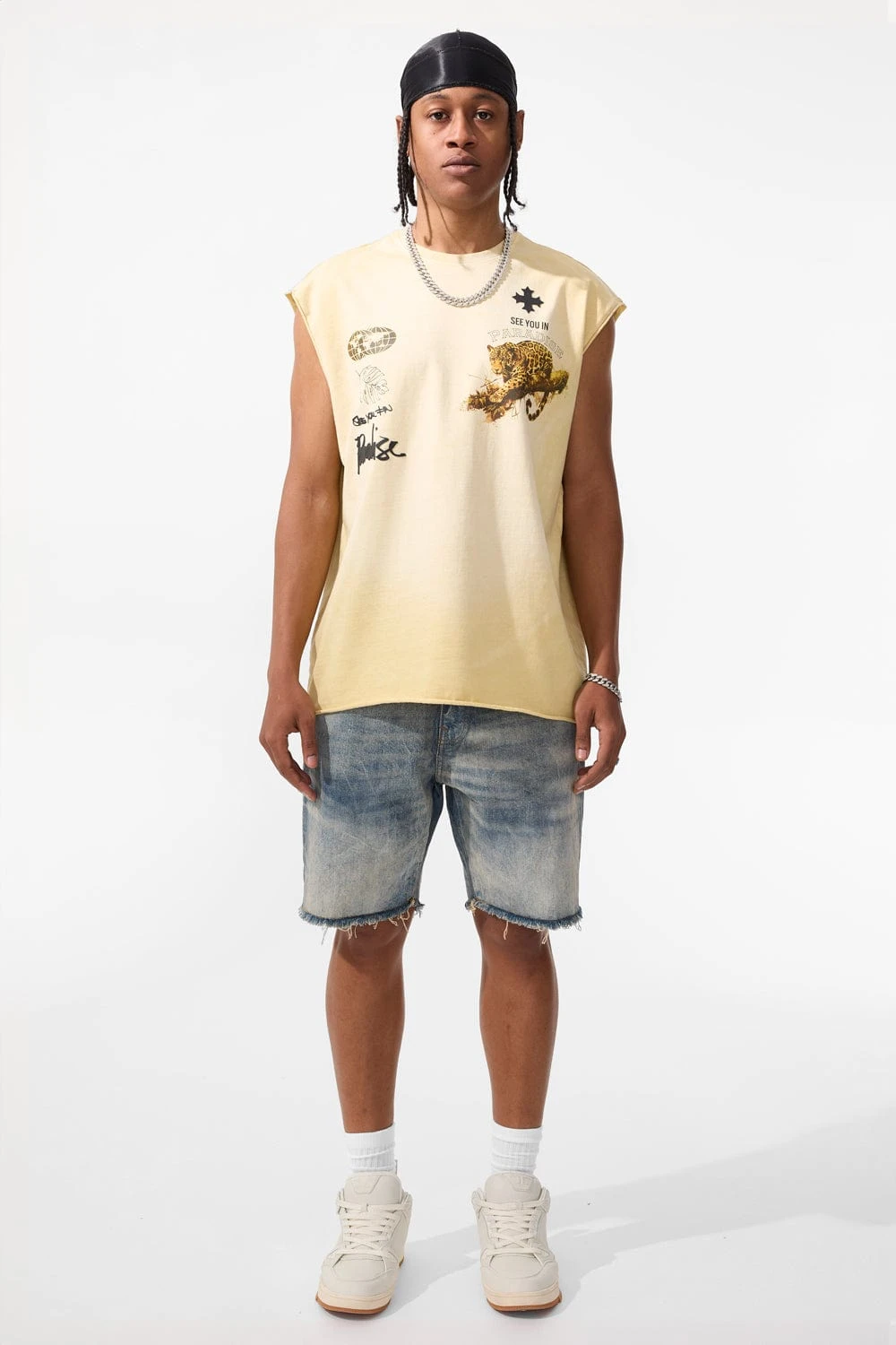 *Cozy is 6’1″ and weighs 170 lbs. He is wearing our The Prowl Cut Off T-Shirt (Size Large)